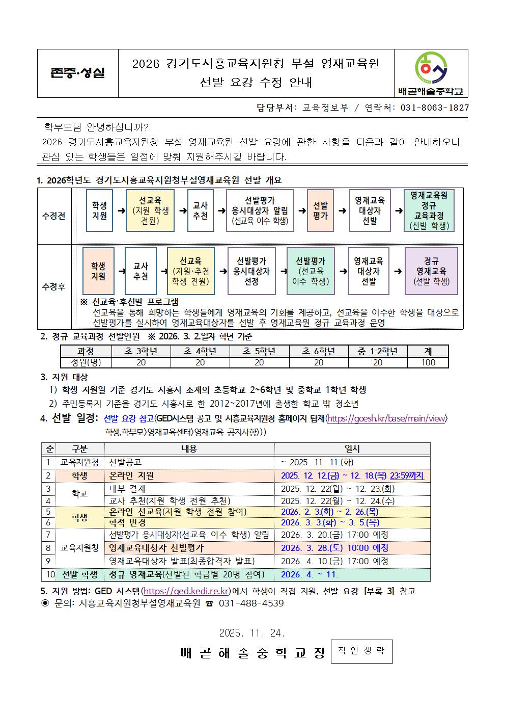 2026 °æ±âµµ½ÃÈï±³À°Áö¿øÃ»ºÎ¼³ ¿µÀç±³À°¿ø ¼±¹ß ¿ä°­ ¼öÁ¤ ¾È³».hwp (548.50KB)